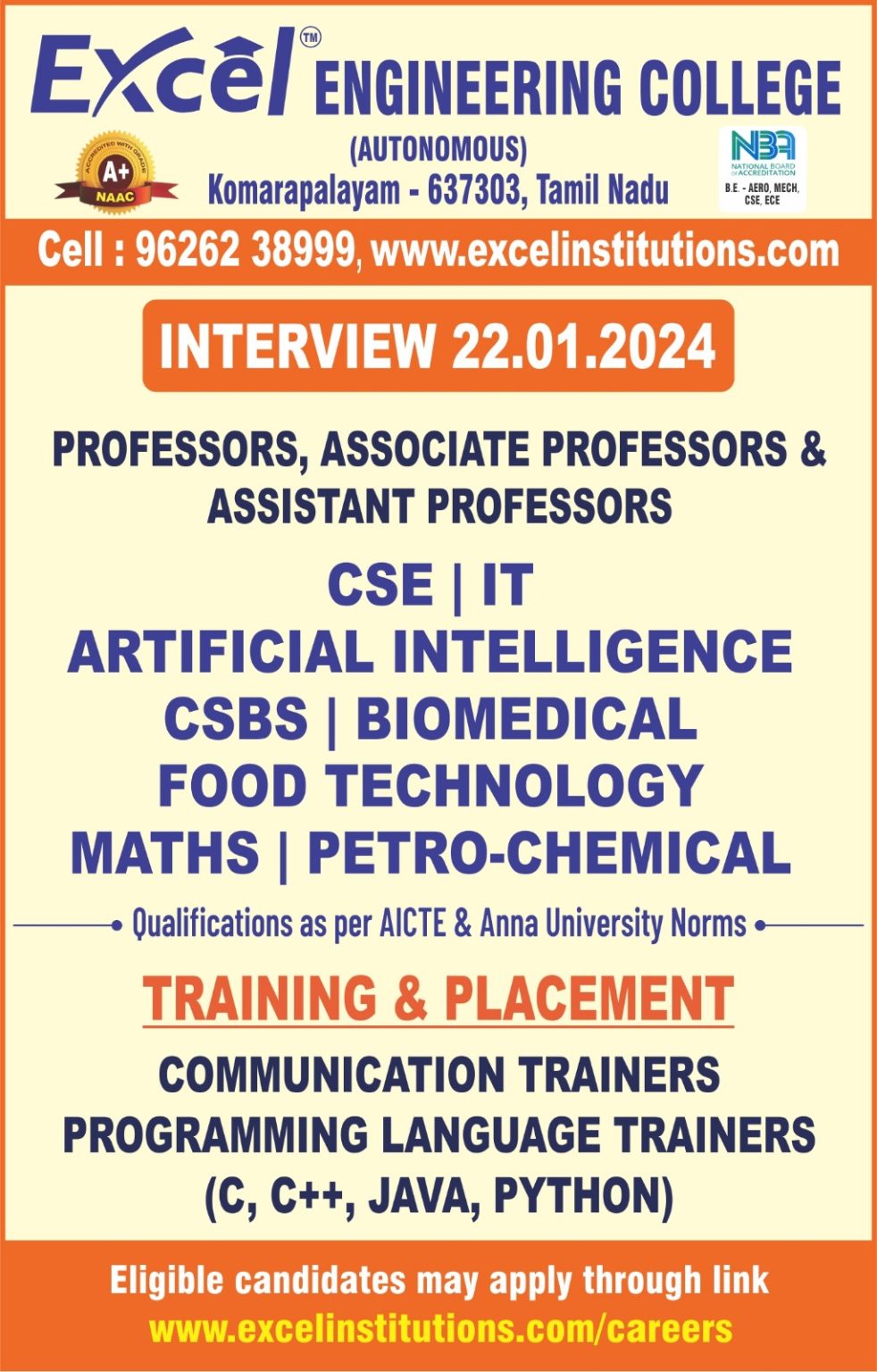 Excel Engineering College, Komarapalayam Wanted Professor/Associate