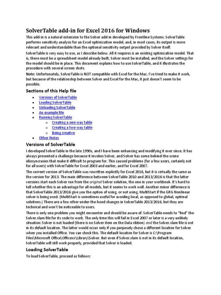 Solvertable AddIn For Excel 2016 For Windows Sections of This Help