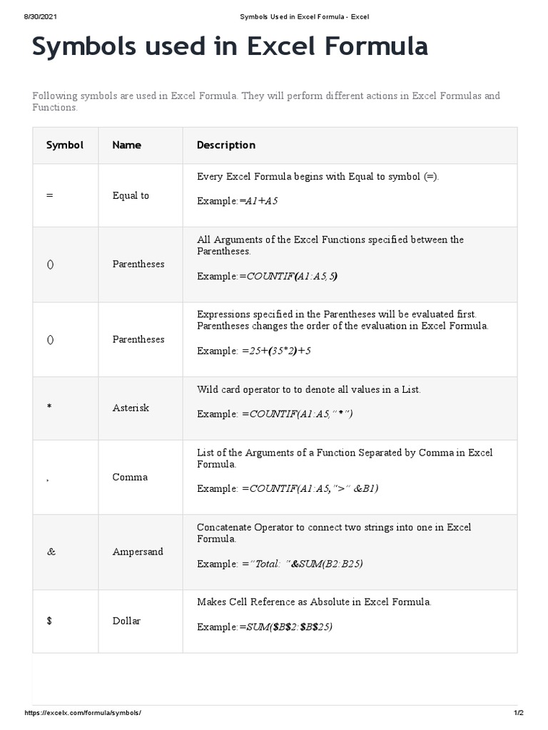 Symbols Used in Excel Formula Excel PDF Bracket Formula