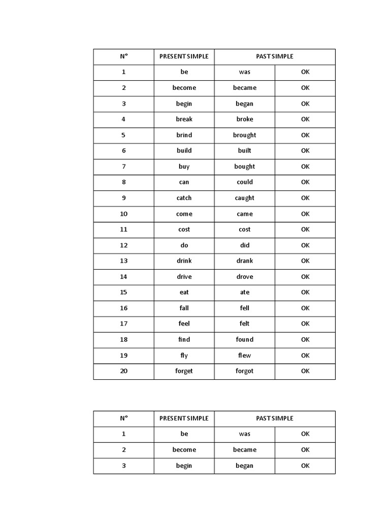 Irregular Verb List Printable