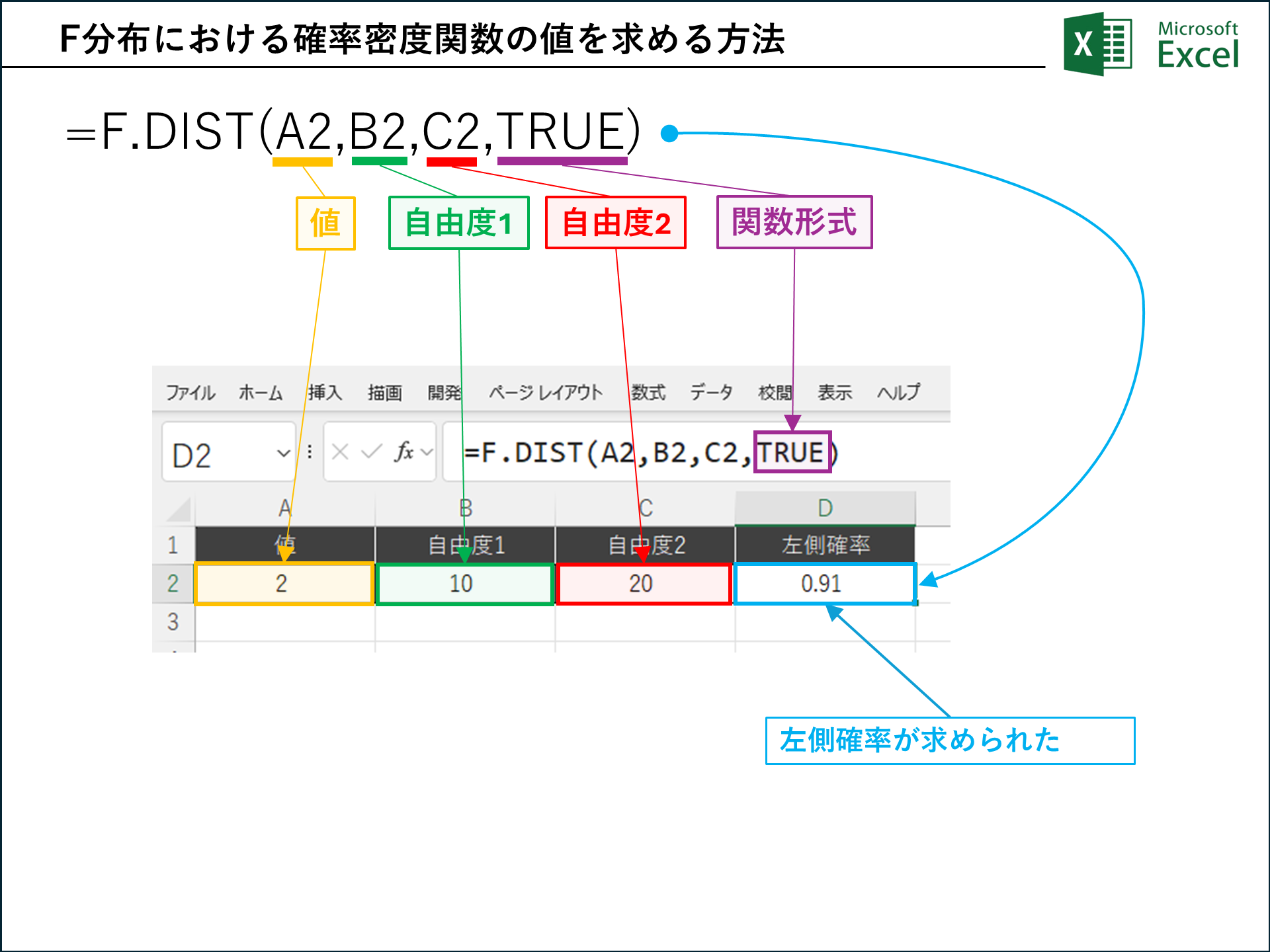 493|Excel F.DIST関数:F分布の累積分布関数(左側確率)を計算