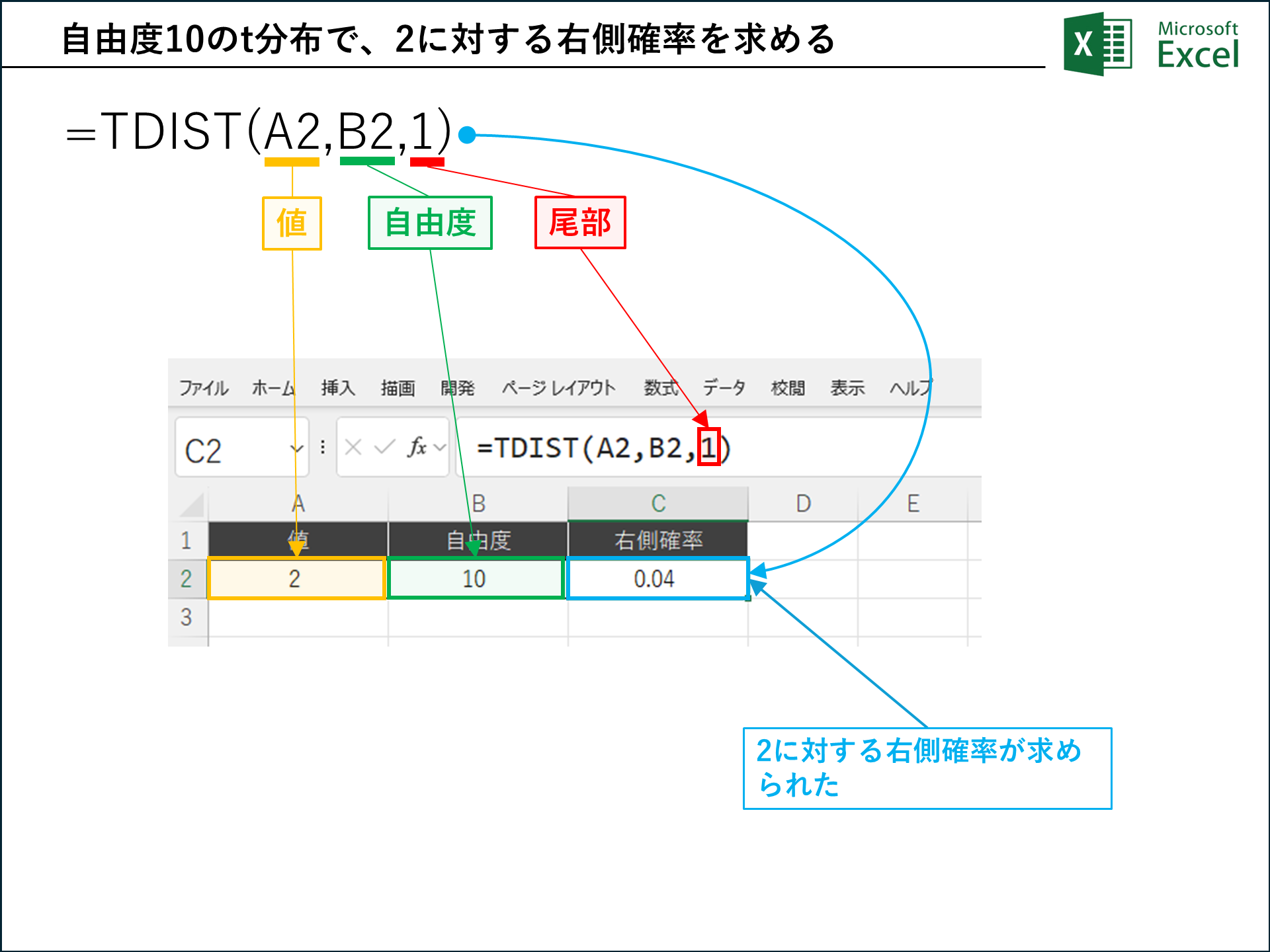 488|Excel TDIST関数:t分布の片側・両側確率を計算