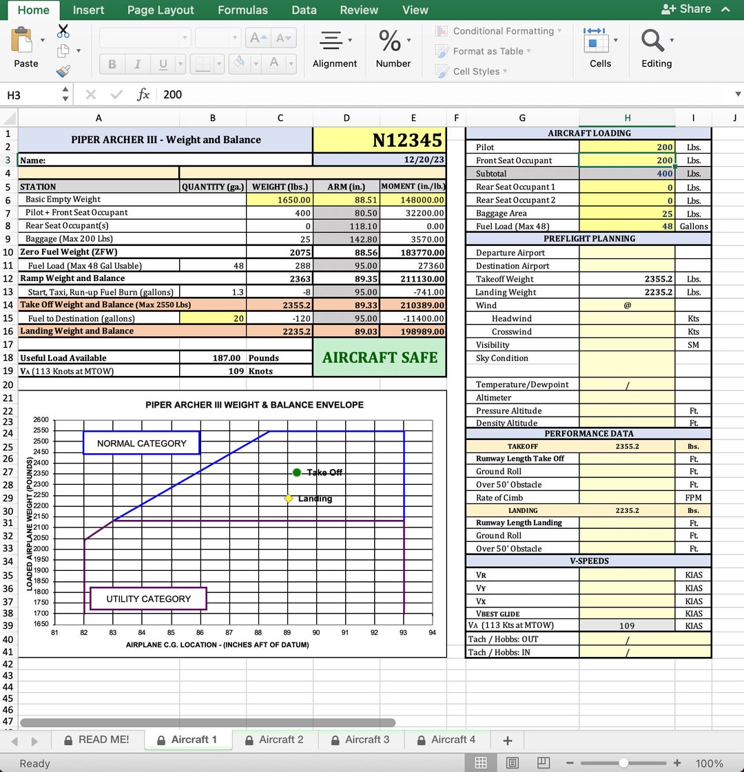 Aircraft Weight and Balance Google Sheets Spreadsheet